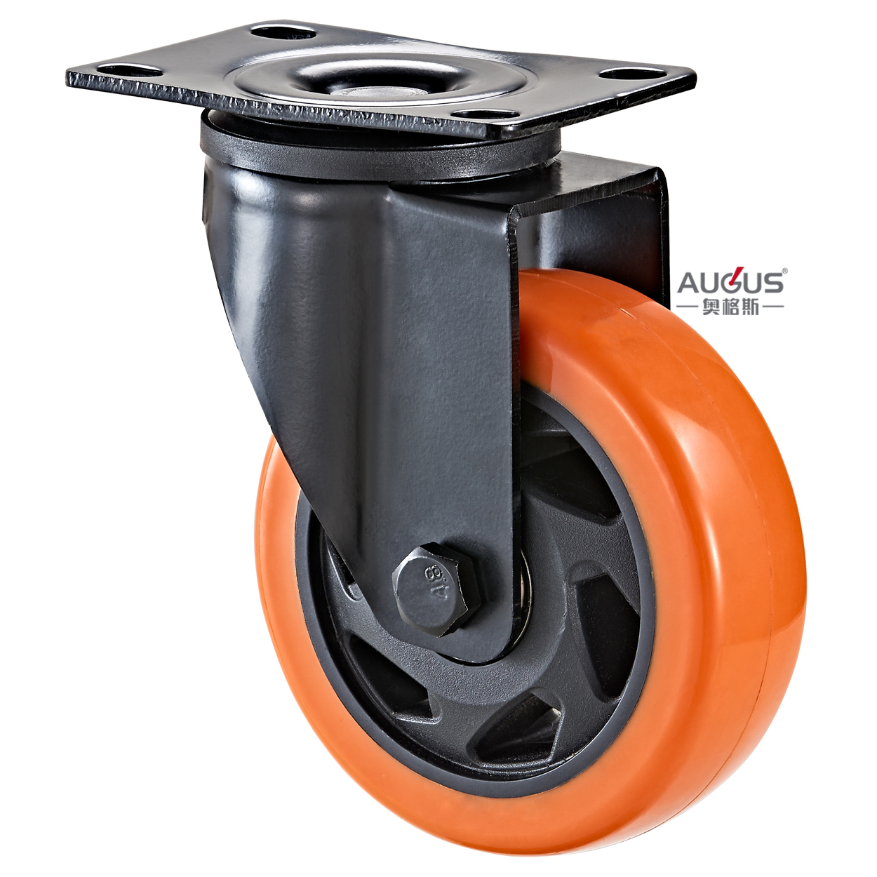 Install with nut, axle and bush, the wheel tread is made of PU (Polyurethane), the wheel center is made of PP (Polypropylene), with double bearing and black plastic cover