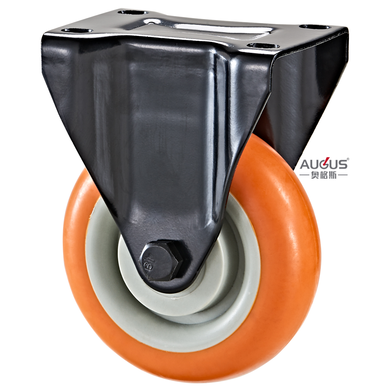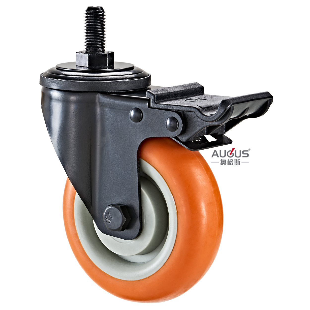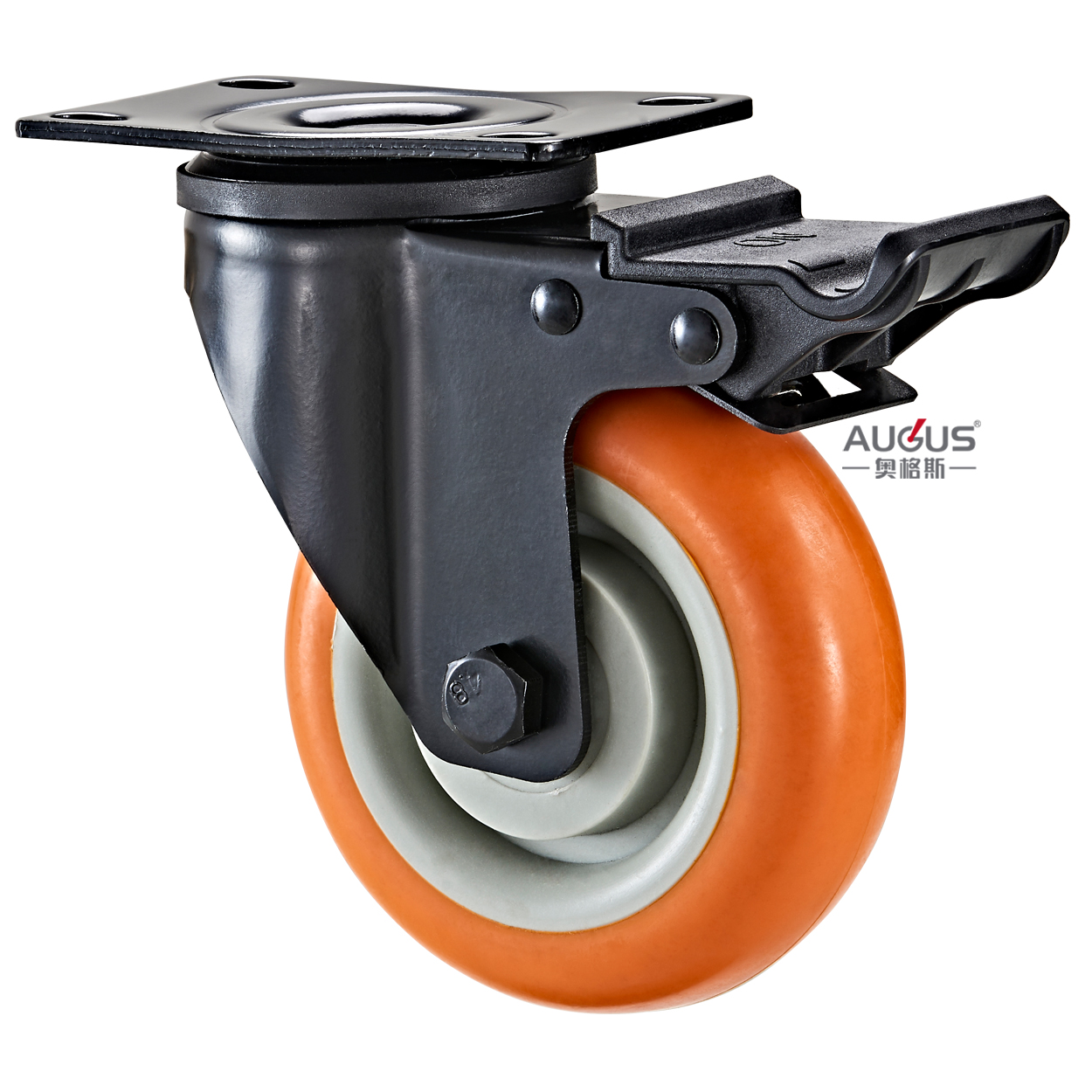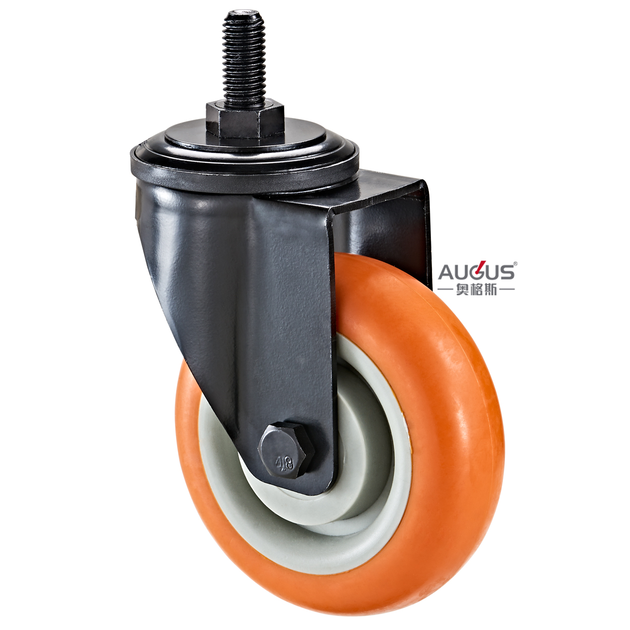 Install with nut, axle and bush, the wheel tread is made of PU (Polyurethane), the wheel center is made of PP (Polypropylene), with double bearing and black plastic cover