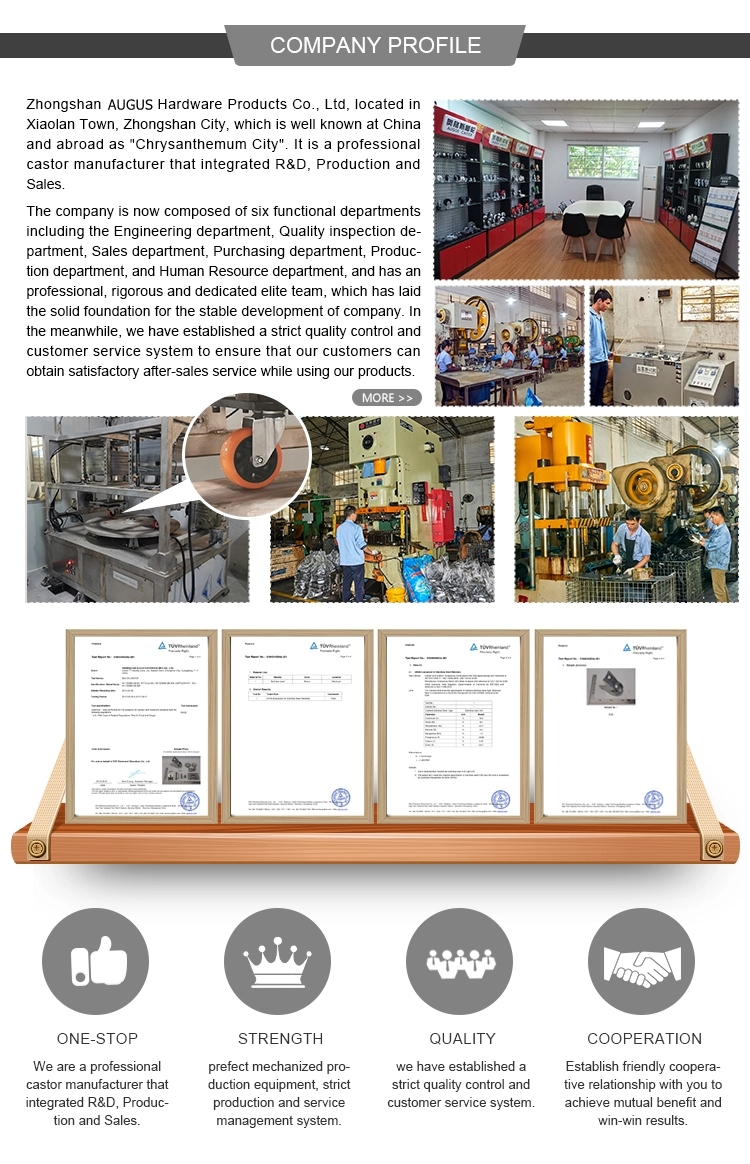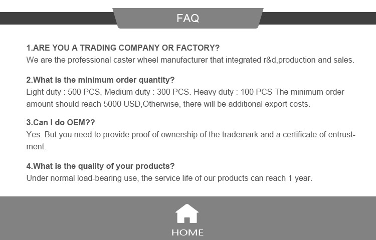 Alternative wheel materials: PU /PP/PA/TPR/Elastic Rubber/ PVC/Aluminum Core PU/Iron core PU/ Antic-Static TPR/ Black Rubber/